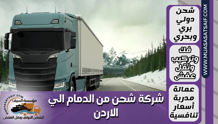 في شركة شحن من الدمام الي الاردن الرائدة نقدم لكم افضل خدمات الشحن والنقل لكافة الأغراض، تعد مؤسسة السيف طريقك لشحن العفش بكل سهولة حيث تلتقي التميز والكفاءة لتحقق تجارب الشحن الفائقة كما نفخر بتقديم خدماتنا المتميزة والموثوقة التي تجمع بين السرعة والأمان لضمان وصول شحناتكم بسلاسة وبأعلى معايير الجودة.